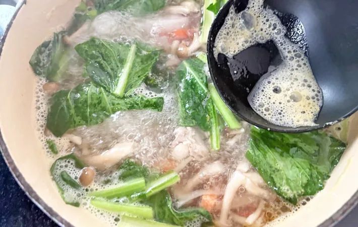沸騰したらアクを取り、具材に火が通るまで蓋をして弱火で10分ほど煮ます。