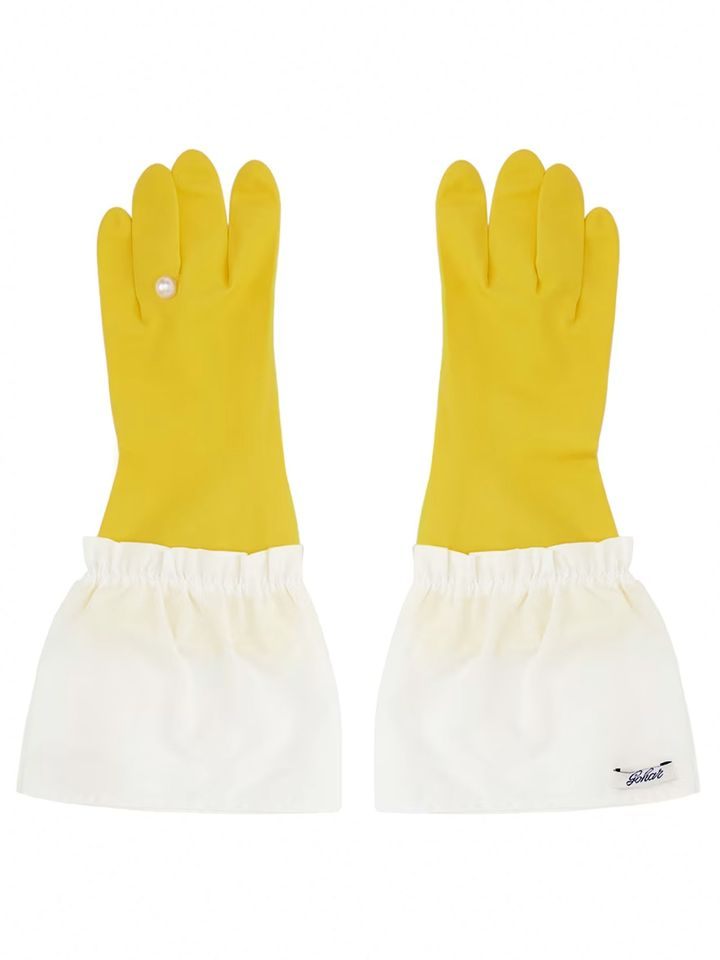 手の甲部分にフェイクパールのアクセントを施したゴム手袋。袖部分もしっかりとカバーしてくれるので、キッチンでもおしゃれでいたいモードなシェフにぴったり!
