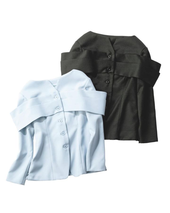 胸元を飾るドラマティックなフリルは、かつてヨーロッパの貴族や格式の象徴とされた〝ジャボ〟から着想。ドレープが美しく、クラシカルだけどモードな印象に