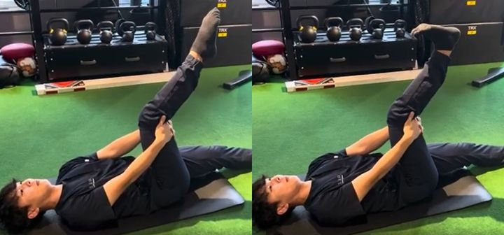 1.仰向けになり、ストレッチを行う脚を曲げて、両手で抱える