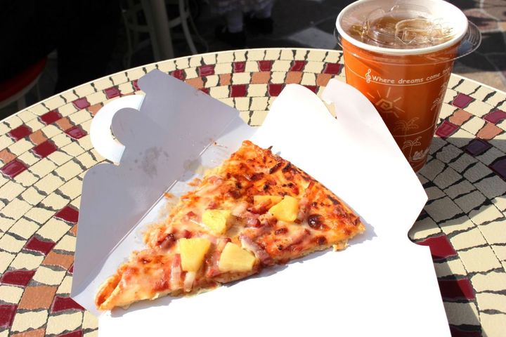 こちらでは、大きくてボリューム満点のピザが味わえます。なかでも「ベーコンとパイナップルのピザ」は、なんと約43年前の開園当初からある貴重なメニュー! ベーコンのうまみとパイナップルの甘酸っぱさが後を引く、シンプルながらも奥深い味わい。たっぷりのったチーズを伸ばして頬張りましょう!