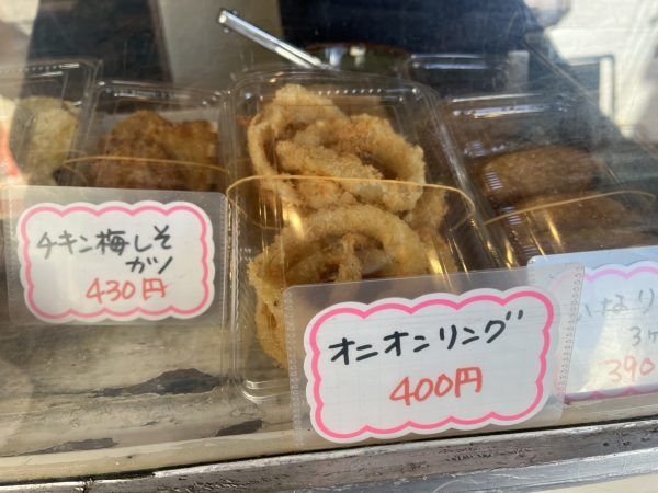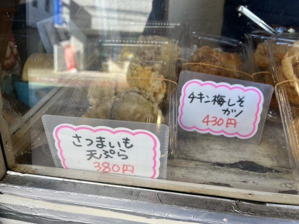 チキン梅しそカツ430円(税込)、オニオンリング400円(税込)、おいなり3個390円(税込)、さつまいもの天ぷら380円(税込)。近所なら仕事帰りに毎日通ってしまいそう。木曜限定で、紅ショウガの天ぷらも販売しているそうですよ。