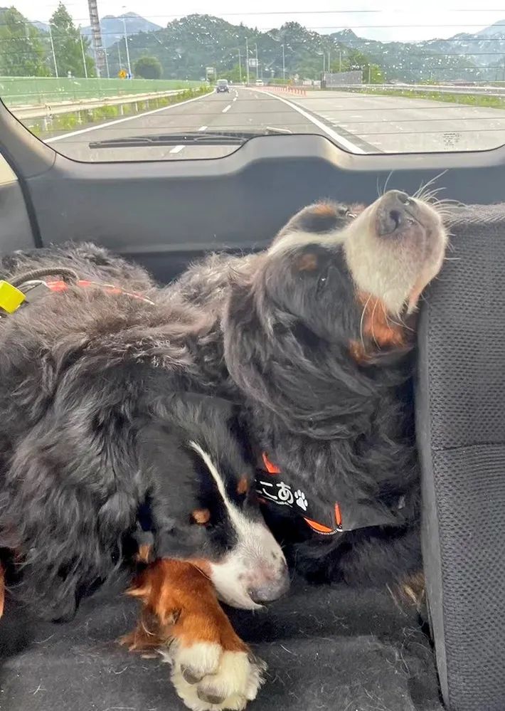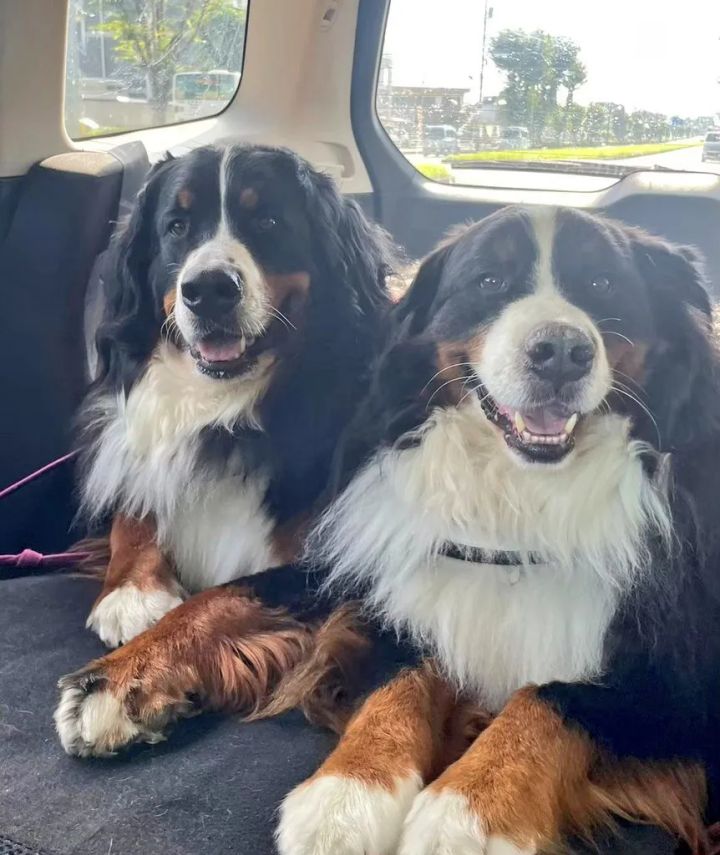 ある日、車に乗って遊びに行った、バーニーズマウンテンドッグのココアくんとエマちゃん。