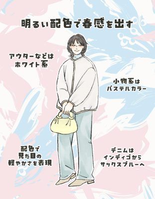 とくにデニムの色は、2月を境にインディゴカラーからサックスブルーへと切り替えるのがおすすめです。たったそれだけのことですが、見た目に春っぽさが出てきます。このほか、ホワイト・アイボリー・パステルイエロー・ライトベージュといった、軽やかさと明るさを感じるアウターやトップスでコーディネートを軽やかにしてみてくださいね。