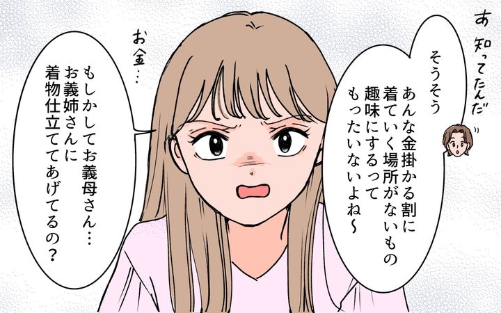 着物に詳しくないけれど、なんとなくかなりのお値段がするイメージ。そんな高価なものをお義母さんはお義姉さんにあげるほど、お義姉さんを大事にしている…? そう思うと、とても悲しくなってくるのです。