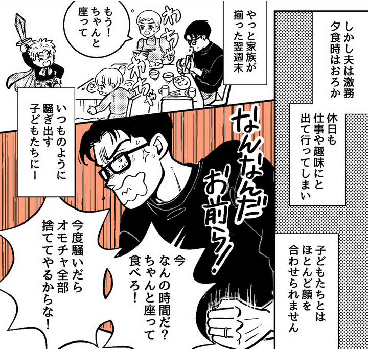 『昨日はフラフラながらも習い事の付き添いをし、どうにか夕飯を作りましたが時間がかかってしまいました。片付けを終わらせて寝室に行くと、上の子が真ん中の子とパパの隣争いで喧嘩をしたらしく、旦那が上の子にとんでもない剣幕で怒鳴りつけていました。開いていた窓を閉めましたがそれに対しても「閉めんじゃねーよ!」と怒鳴る始末。その後も泣きじゃくる上の子への叱責が終わらず私が止めても「うるさい、黙れ! 早く窓開けろ!」と怒鳴りつけるばかり。仕方なくリビングに避難して具合が悪いなかソファで寝ることになりました』出典:https://mamastar.jp/bbs/topic/4505159