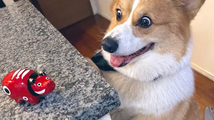 2. 『赤べこ』を初めて見たコーギー リアクションに「見ているだけで笑う」「この目よ」と反響