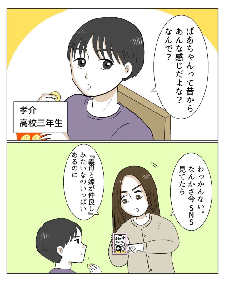 真矢と私の話を聞いていた高校生の息子孝介は「ばあちゃんって昔からあんな感じだよな?なんで?」と冷静に疑問を口にしました。「わっかんない。なんかさ、今SNS見てたら『義母と嫁が仲良し』みたいなのいっぱいあるのに」とスマホを見せながら孝介に話す真矢。
