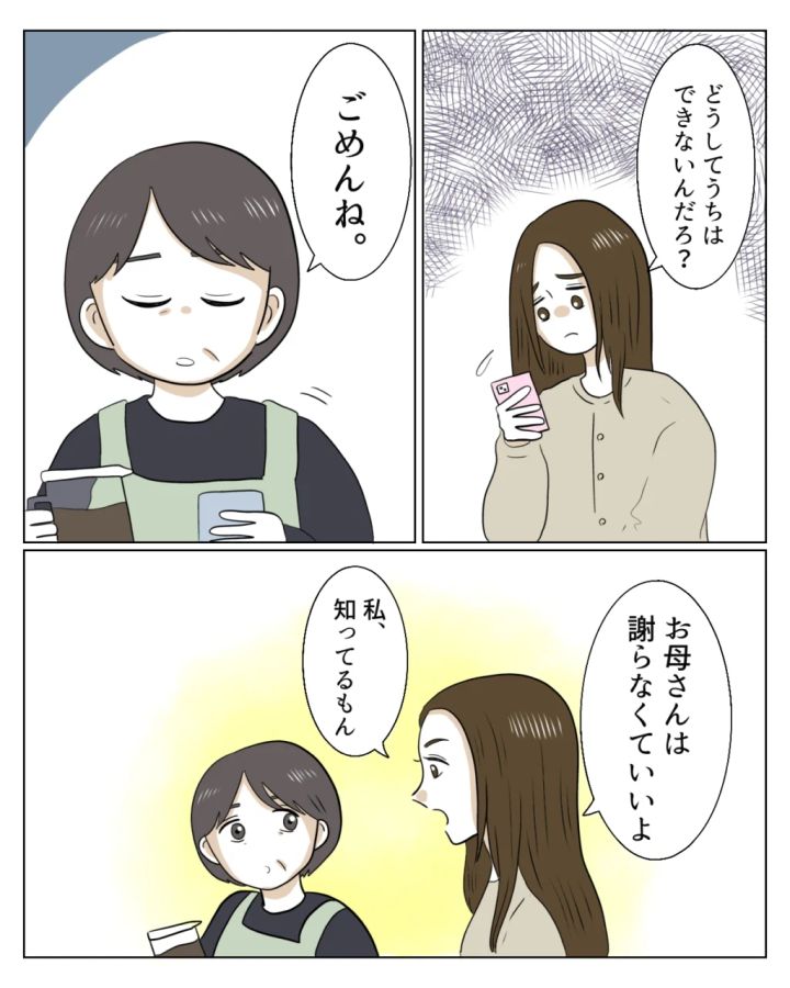 「どうしてうちはできないんだろ?」と真矢がしゅんとしながら言いました。自分の母親とおばあちゃんの仲が良くないのは悲しいですよね。私が「ごめんね」と謝ると、真矢は「お母さんは謝らなくていいよ」と言ってくれました。