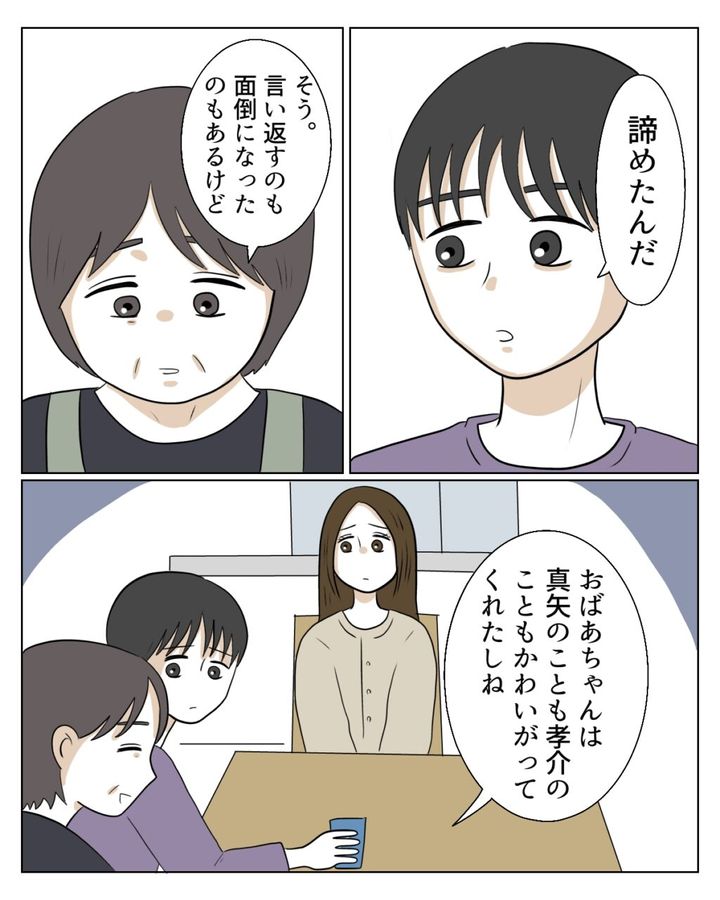「諦めたんだ」と私の気持ちを推察する孝介に、「そう。言い返すのも面倒になったのもあるけど、おばあちゃんは真矢のことも孝介のこともかわいがってくれたしね」と笑いながら話しました。お義母さんは私のことは気に入らないようですが、子ども達のことはかわいがってくれているので我慢できているのかもしれません。