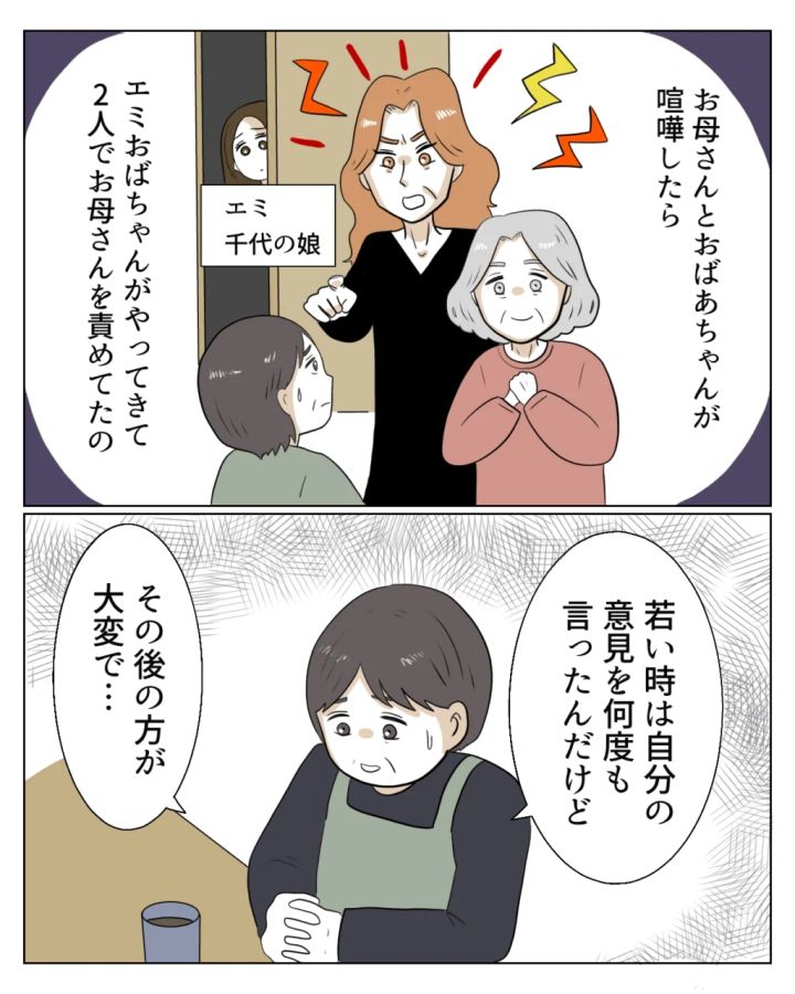 「お母さんとおばあちゃんが喧嘩したら、エミおばちゃんがやってきて2人でお母さんを責めてたの知ってるもん」と真矢は私に同情してくれました。そうなのです。お義母さんは何かあるとすぐにお義姉さんに連絡して私のことを悪く言うのです。お義姉さんは私の話は聞いてくれず、お義母さんの言うことを鵜呑みにして一緒になって私を責めました。「若い時は自分の意見を何度も言ったんだけど、その後の方が大変で・・」と話しながら、そのときのことがよみがえってきて辛い気持ちになりました。