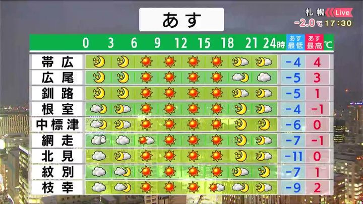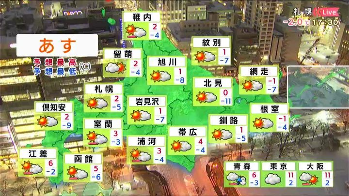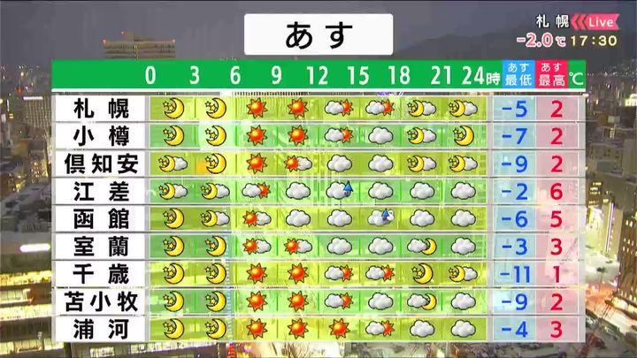 あすは天気が回復し、道東を中心に晴れるでしょう。最高気温は広くプラス気温で、道南、太平洋側で5度くらいまで上がる見込みです。屋根からの落雪、なだれに注意してください。