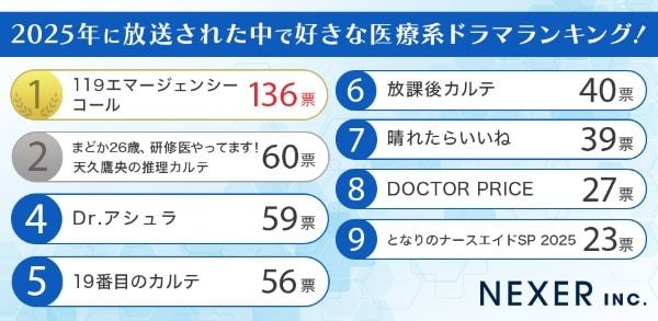 NEXERはこのほど、好きな医療系ドラマランキングを発表しました。同ランキングは、1月9日~19日に実施した 「2025年に放送された好きな医療系ドラマに関するアンケート」調査の結果をもとに算出しています。
