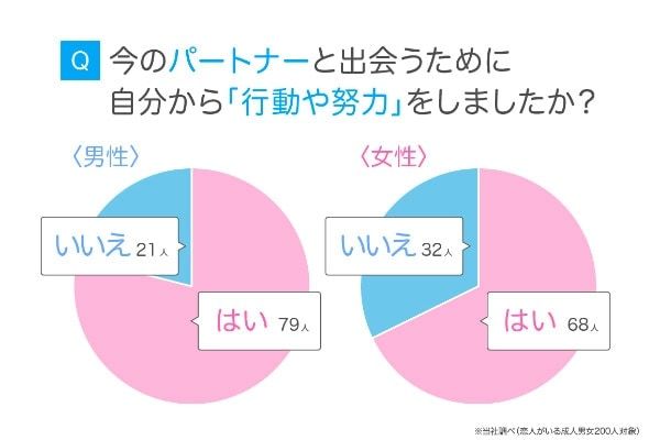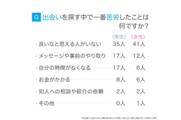 今のパートナーと出会うために、自分から行動や努力をしたか尋ねると、男性79人、女性68人が「はい」と回答しました。出会いを探す中で一番苦労したことについては、男女ともに「良いなと思える人がいない」の声が最多となっています。