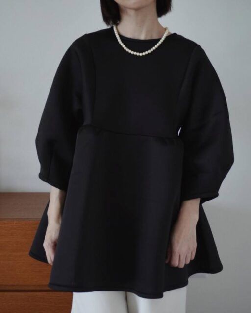 フォーマルなシーンにはもちろん、ちょっとしたお出かけにもあると便利なのはパールネックレス。首元の詰まった黒のペプラムカットソーには、やや大粒のパールネックレスを合わせると華やかさがアップします。