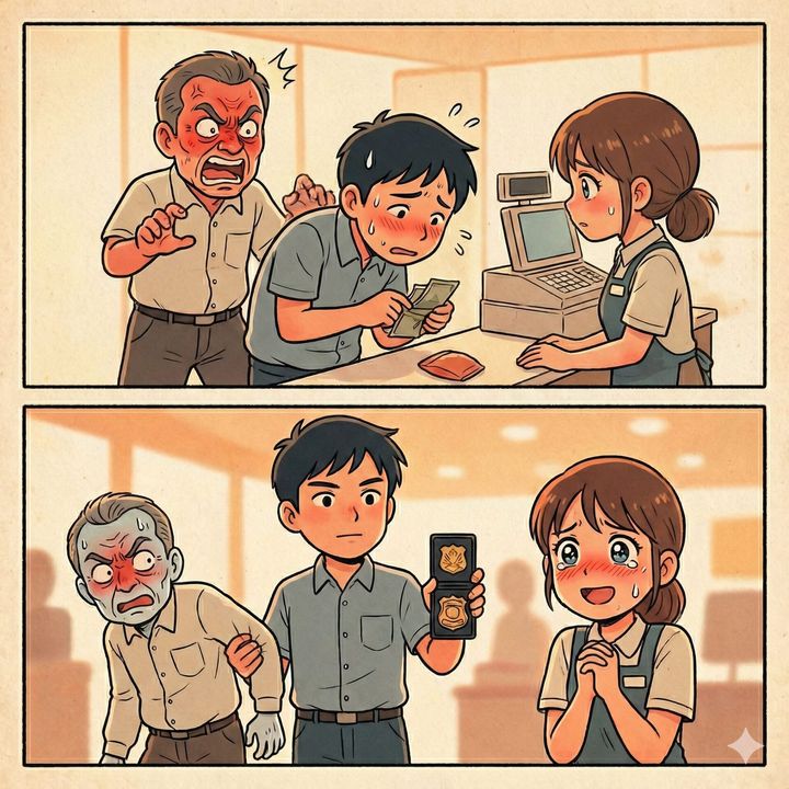 3. 「俺は急いでんだよ!」とカスハラする客。だが、会計中の他の客が懐から手帳を出すと、店内の空気が凍りつく