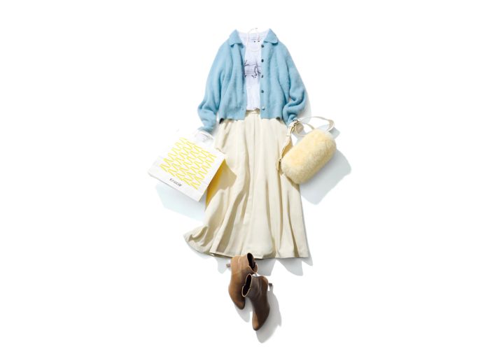 パステルブルー×クリームは愛らしいのに嫌味がないので、お仕事シーンにもおすすめ。でも甘さ100%は照れるから、インはフォトプリでちょっぴり辛さをプラス!