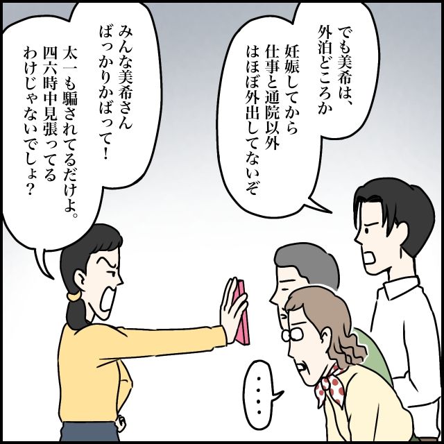 すると太一が、「でも美希は、外泊どころか妊娠してから仕事と通院以外はほぼ外出してないぞ」と反論。「みんな美希さんばっかりかばって!太一も騙されてるだけよ。四六時中見張ってるわけじゃないでしょ?」と太一さんの話もまともに聞かず言い返す玲美さん。その時、義母が「・・・」何か考え事をしているように無言で呟きました。