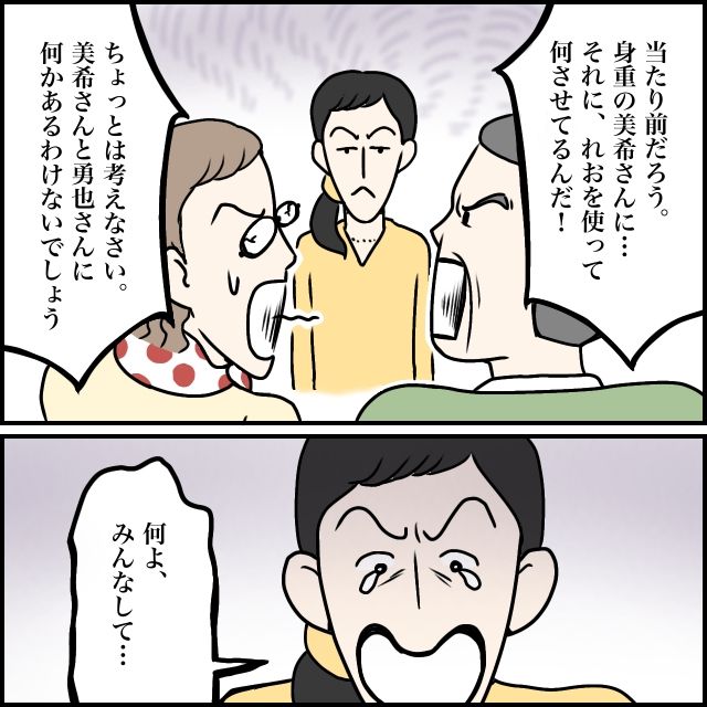 「当たり前だろう。身重の美希さんに・・それにれおを使って何させてるんだ!」「ちょっとは考えなさい。美希さんと勇也さんに何かある訳ないでしょう」義父母にそう詰め寄られ、「何よ、みんなして・・」と玲美さんは半泣きに。