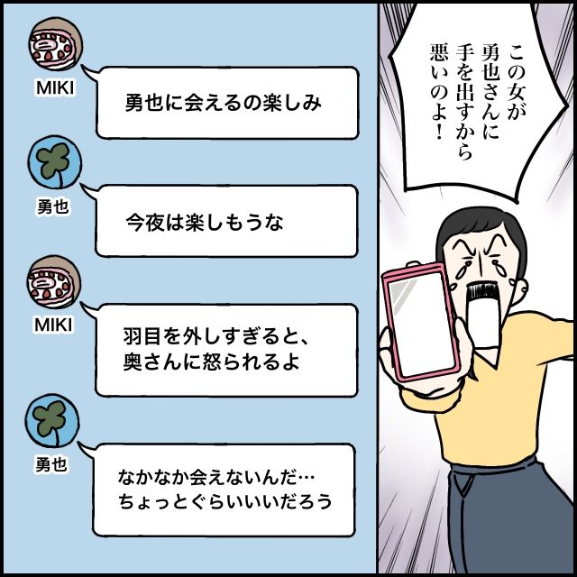 すかさずスマホを取り出して、「この女が勇也さんに手を出すから悪いのよ!」と叫びました。スマホ画面にはメッセージのやり取りが。
