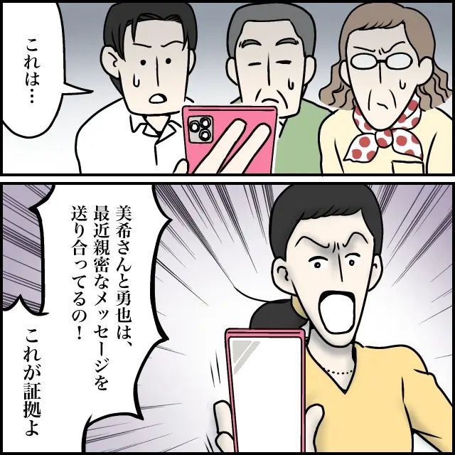 スマホ画面をみんなで眺めながら「これは・・」太一がそう呟くと、「美希さんと勇也は、最近親密なメッセージを送り合ってるの!これが証拠よ」と勝ち誇ったように言い切る玲美さん。