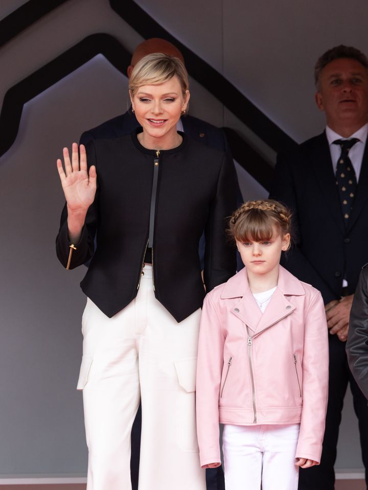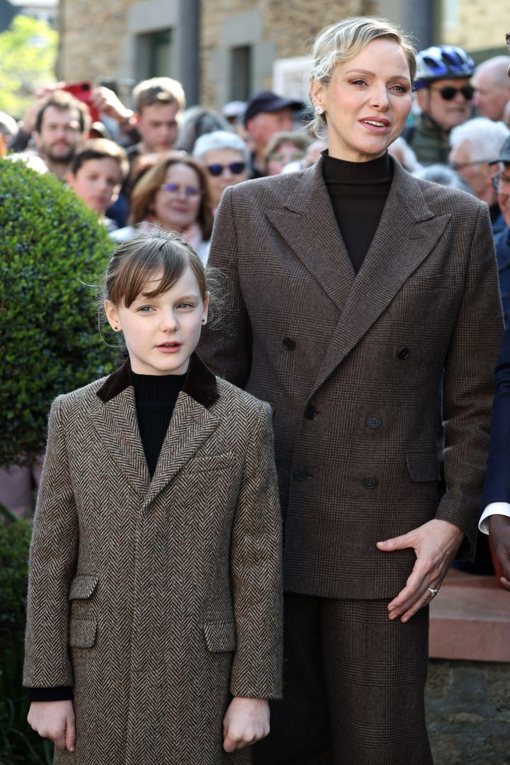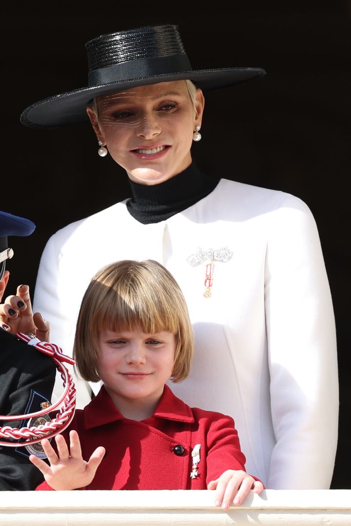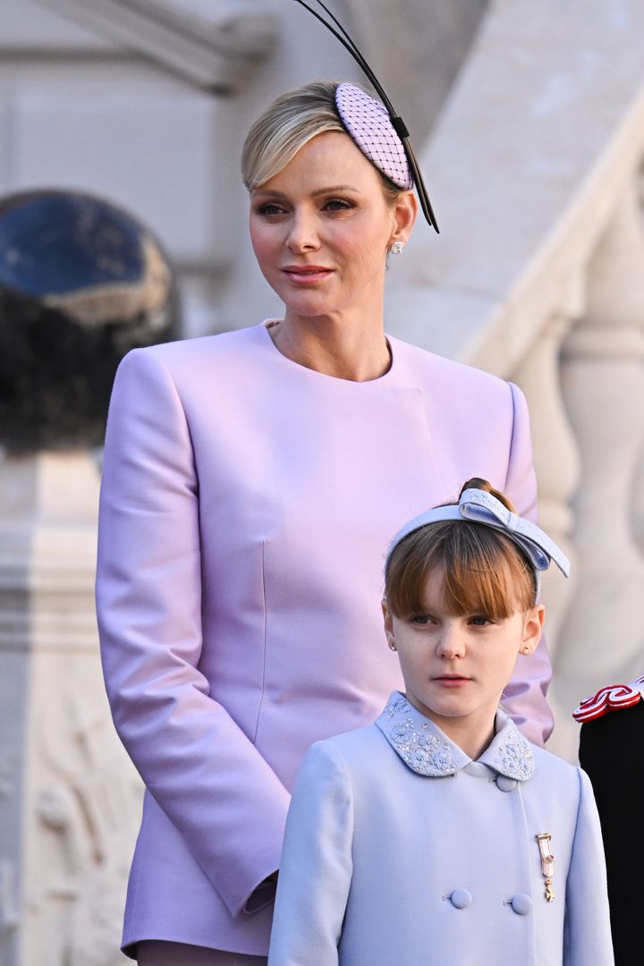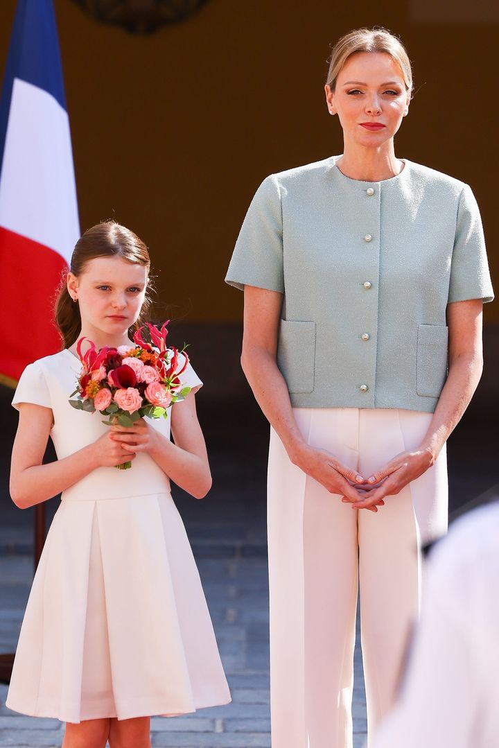 母娘で統一感のあるパステルカラーコーデでナショナルデーの式典に登場。シャルレーヌ公妃のライラックカラーのパンツスーツはルイ・ヴィトンのものだそうで、一方のガブリエラ公女のライトブルーのコートは、さすか小さなファッショニスタ、なんとディオールのビスポークのものだという。