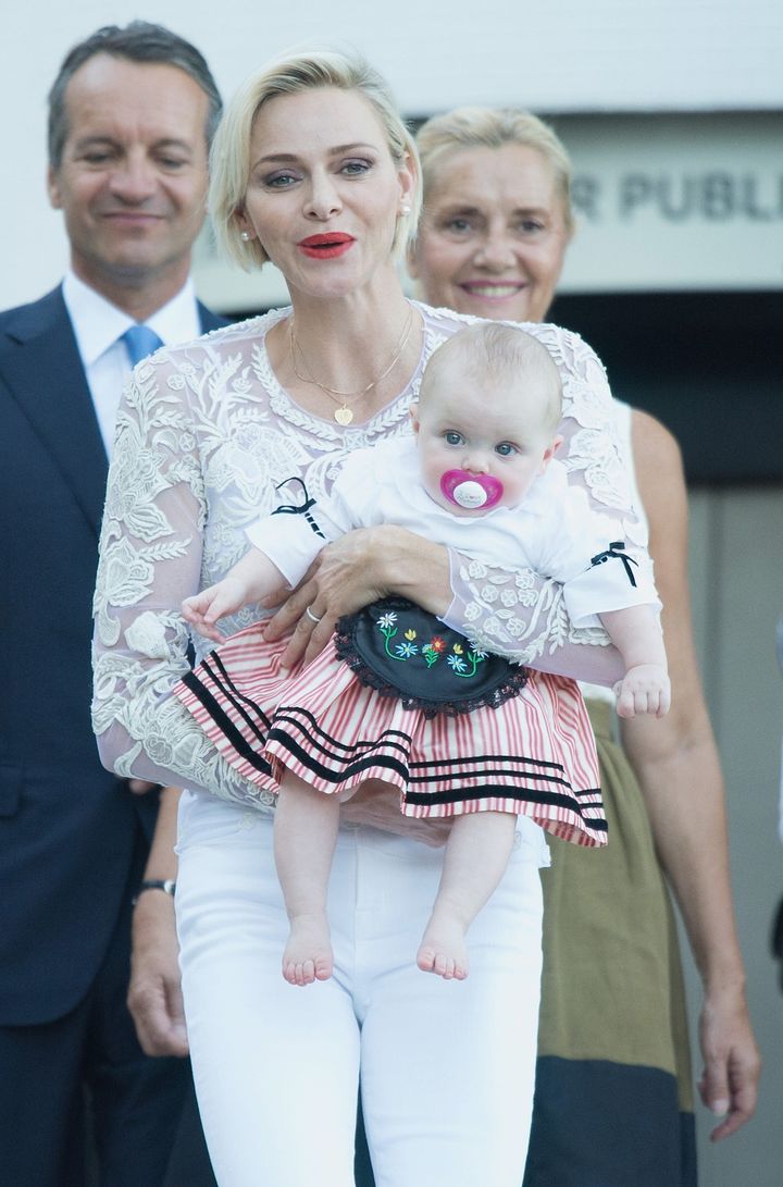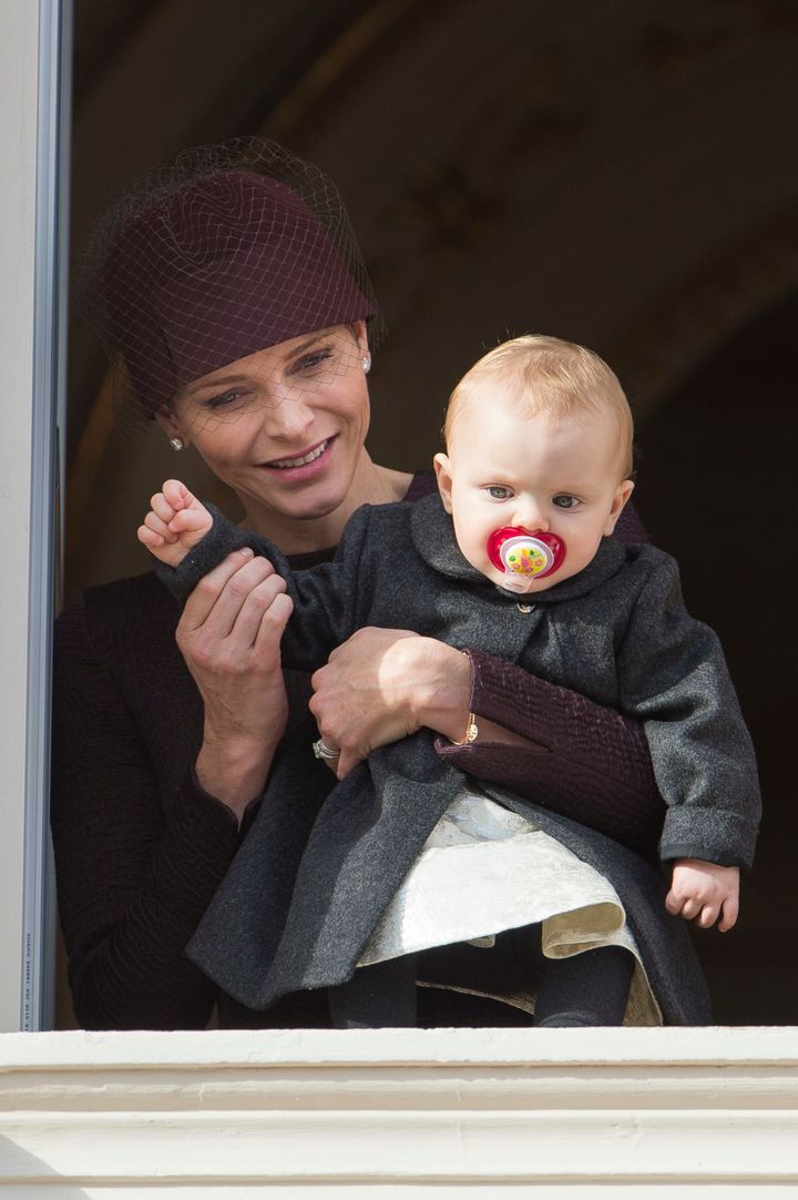 ナショナルデーでは、シャルレーヌ公妃がもうすぐ1歳になるガブリエラ公女を抱いてバルコニーにお出まし。バルコニーデビューとなった公女は、真っ赤なおしゃぶりをしてまるでお人形のよう。