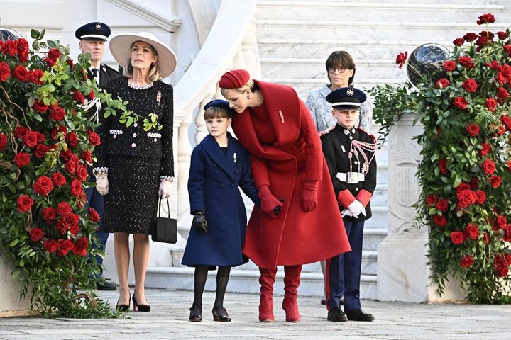 ナショナルデーにて。バルコニーに登場したシャルレーヌ公妃はアクリスのロングコートに、インナーのタートルネックやハットに黒を選んでモノトーンルックでお出まし。ガブリエラ公女は赤いコートに、(この時は脱いでいたが)黒のハットを合わせていた。母娘で、黒を差し色にしたモナコのフラッグカラーコーデで建国記念日をお祝いしたようだ。