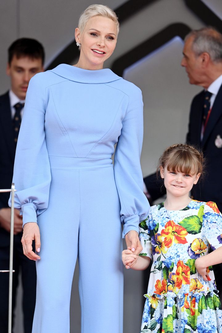 一家そろってF1モナコグランプリの決勝を観戦。難易度の高いスカイブルーのジャンプスーツを圧巻のオーラで着こなしているシャルレーヌ公妃と、ドルチェ&ガッバーナのフラワープリントのワンピースをまとったガブリエラ公女が手をつないで仲良さそうな様子にほっこり。 クールなルックの公妃と、スウィートなスタイルの公女、それぞれの魅力が光っていた。