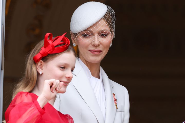 シャルレーヌ公妃は全身ホワイト、一方のガブリエラ公女は真っ赤なコートドレスにヘッドバンド姿で現れ、母娘でモナコ公国のフラッグカラーを彷彿とさせるルックを見せた。