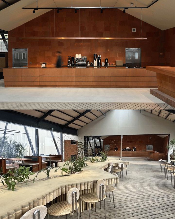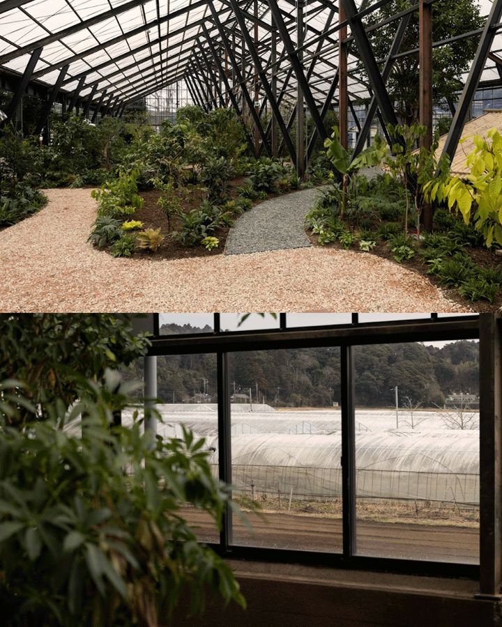 温室内に設けられたレストラン・カフェは、味覚を通して植物と人との関係を改めて感じられる空間。食堂のような自由さと、細部にまで宿るこだわりが生む心地よさを大切にし、温室内の好きな場所で思い思いに食事を楽しめるのも魅力だ。インテリアにも植物との距離を縮める工夫が随所に施されている。中央の大きなテーブルには、組んだ竹に藁と土を練り合わせた素材を用い、大地を感じさせる意匠に。壁には柿渋を塗った和紙を張り合わせ、やわらかな光と温もりを空間にもたらしている。