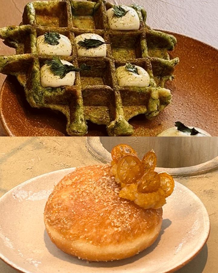スイーツも見逃せない。よもぎとニッキがふわりと香るワッフル(写真上)は、噛むほどにやさしい苦みと甘みが広がり、焼き立てならではの香ばしさとともに、植物の力強さを感じる一品だ。苑内に自生する3種の柑橘を用いたドーナツ(写真下)は、軽やかな生地に自然な甘みが重なり、後味はすっきり。どちらも、植物の個性を生かした仕立てだ。