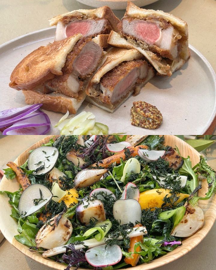 例えば「猪肉のかつサンド」(写真上)には、千葉で害獣として捕獲された猪を使用。赤身と脂の力強いうま味を、ハーブと玉ねぎで炒めた具材とともにサンドし、野性味と清涼感が調和する味わいに仕上げている。「大多喜サラダ」(写真下)は、その日に収穫した5種以上の野菜やハーブを盛り込み、苑内に自生する柑橘のソースでまとめた一皿。土地の息吹をダイレクトに感じられる。
