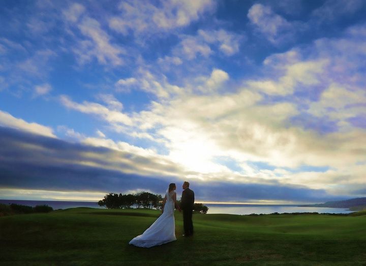 <写真>ゴルフコースの芝と海、そして広い空。 余白のある風景が、二人のシルエットをドラマチックに引き立てる一枚。