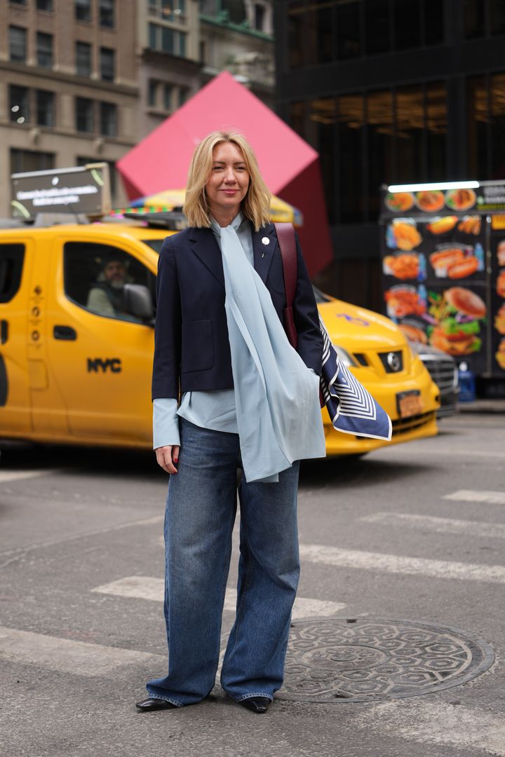 カジュアルなデニムとエレガントなブラウスのディテールが相性抜群。デイリースタイルを格上げする一着。