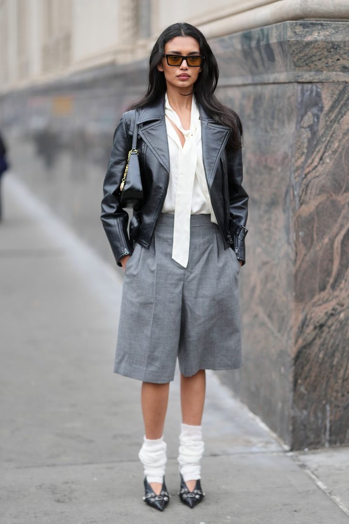 シフォンのようにエアリーなボウタイが、エッジィなデニムジャケットやレザーショートパンツと好相性。ブラウスのレディな印象を程よく中和するモードな小物使いにも注目。