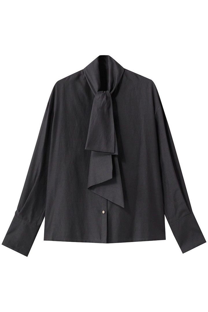 甘さを控えた艶やかなチャコールグレーが魅力的。エレガントなムードと落ち着いた印象を兼ね備えたブラウスは、ビジネスシーンでも重宝するはず。