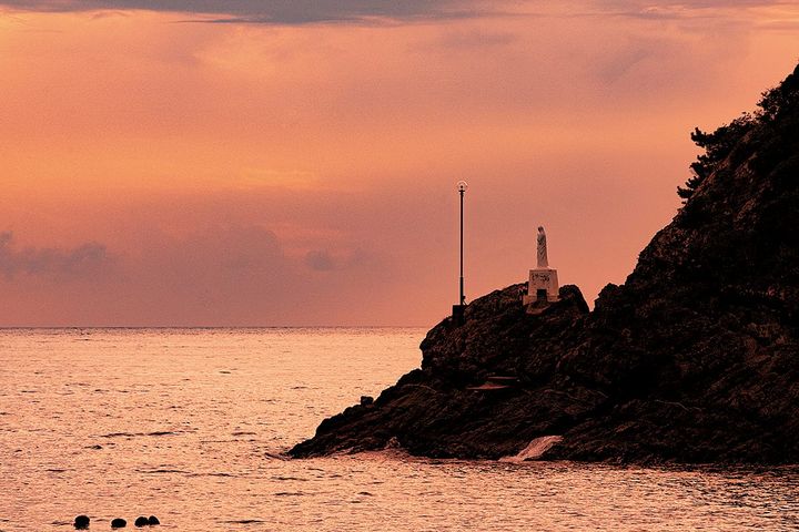 岬の突端の岩壁に立つ純白のマリア様が、入り江を出る漁船を見守り、漁の安全を祈っています。﨑津教会の信徒でもある漁師たちが、昭和43(1968)年に立てたこのマリア像は、いつしか「海上のマリア像」と呼ばれるようになりました。地上からは近づくことができず、遠く横顔を見るのみですが、全身を茜色に染め、沈む夕日のなかに立つ姿は神々しいばかりです。