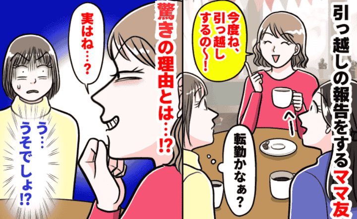 そのひと言に、一瞬「訳あり……?」と空気がピリッとしたのですが、私たちの子どもは年中さんで「小学校のため?」「2人目が生まれるから広いとことろにするの!?」など話していました。引っ越し宣言をしたママ友は、なぜか終始ニヤニヤしていて……。