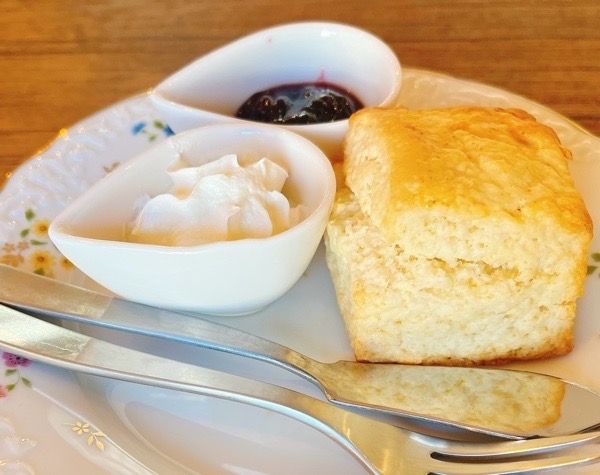 小ぶりのスコーンには生クリームとジャムが添えられています。ジャムはイチゴとブルーベリーから選べました。