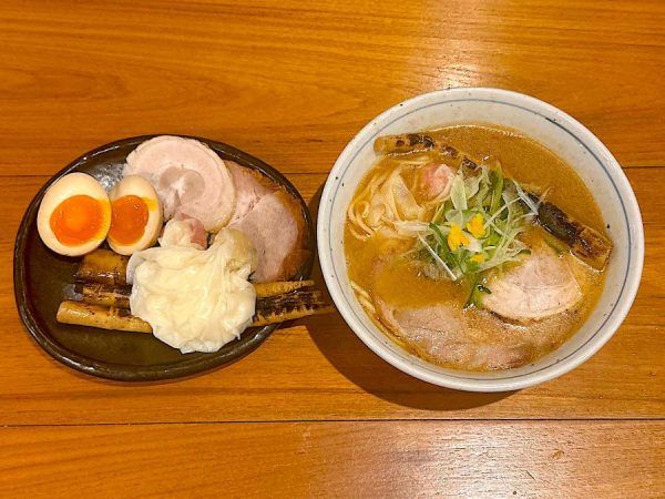 +500円でオーダーできる「裕盛り」は、トッピングが全種類のっています。(写真・右) 甘めの味付けで仕上げられた3本の「姫竹メンマ」は、炙ることで香りが一層引き立ち格別の味わい。 肉のうまみがたっぷり詰まった「炭焼きチャーシュー」は肩ロースと豚バラの2種。 とろりとした黄身が絶品の「味付け玉子」、蟹身と貝の入った自家製ワンタンが各1個ずつのった、豪華な内容です。 《裕盛り 500円》
