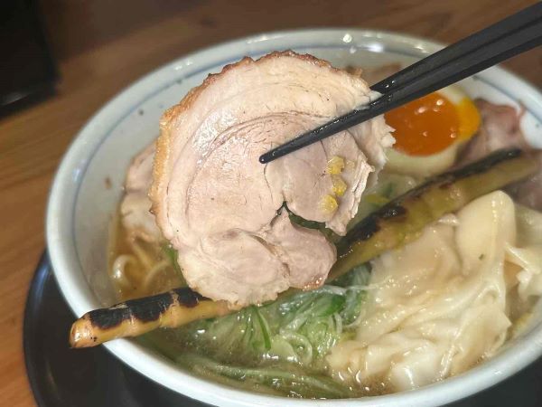炭火で焼き上げたチャーシューは肉の旨みがしっかりと感じられる仕上がり。 一杯につき、肩ロースと豚バラの2種が必ず入っており、実力店ならではの存在感を放っています。