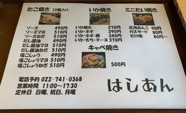 仙台では珍しいいか焼きもあり、たこ焼き、キャベ焼き、ミニたい焼きと揃っている、魅力の「たこ焼き はしあん」さん。