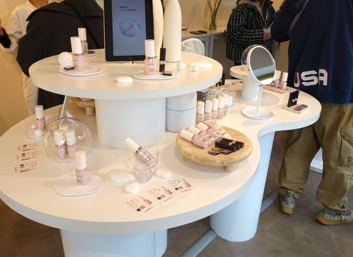 タッチアップコーナーには、白玉ファンデ美容液の他に、トッピングで登場したリップ3種類、アイシャドウ3種類がずらり。クレンジングやコットン、鏡なども用意されており、気になるアイテムを自由に試せます。スイーツもコスメも一度に楽しめる特別な体験ができました。