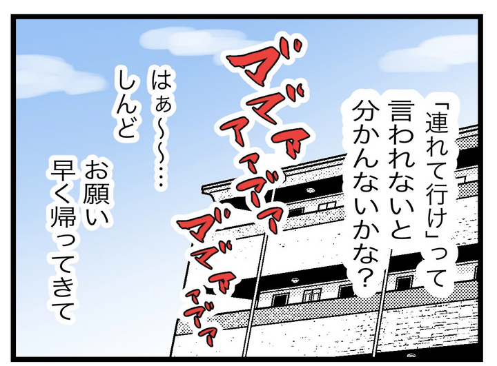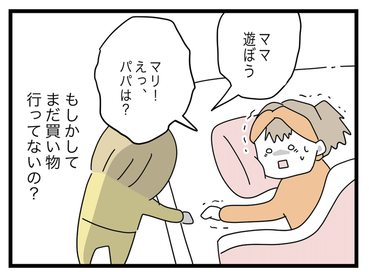 スーパーとパン屋に行ってほしいとは伝えたけれど、確かに娘を連れていってとは言わなかった…。でも、まったく動けない状況を知っているなら、配慮して娘を連れていってくれたらいいのに…! 本当に言われたことしかやらない夫に失望しつつ、娘に申し訳なさを感じつつ…。ただただ早く夫が帰ってくるのを妻は待つしかないのでした。