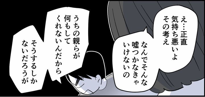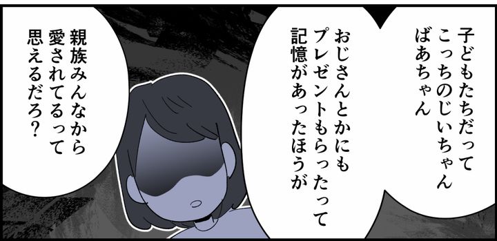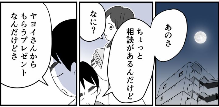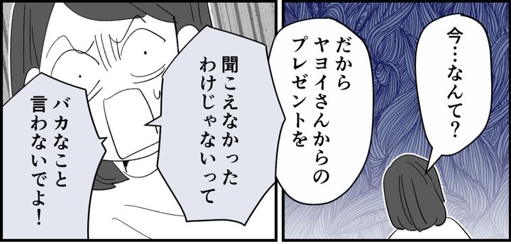 「ヤヨイさんからもらったプレゼントやお祝い、うちの両親や兄からもらったってことにしてよ」一瞬何を言われたのか理解できず、固まってしまいました。ユウスケの主張に、私は顔をゆがめます。はっきり言って、その考えが気持ち悪い。なんで子どもたちにそんな嘘をつかなきゃいけないのでしょうか。