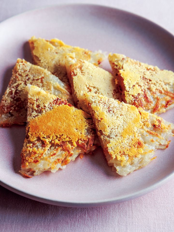 (2)フライパンにサラダ油を中火で熱し、(1)を入れる。木べらで丸く形を整え、3~4分焼いて上下を返し、じゃがいもが少し透き通ってくるまでさらに3~4分焼く。粉チーズをふり、かるくフライ返しで押さえてから上下を返し、チーズがカリッとするまで1~2分焼く。食べやすく切って器に盛る。