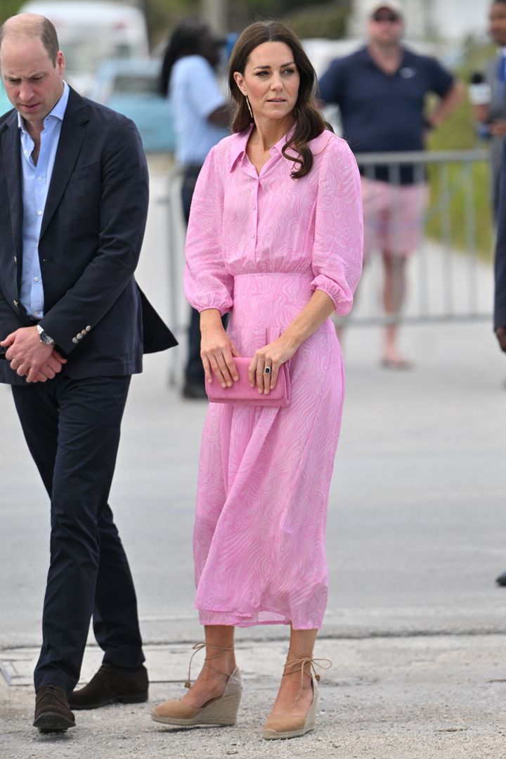 キャサリン妃がカリブ海訪問の最終日に選んだのは、発色の美しいリキソーのバブルガムピンクのワンピース。パフスリーブや透け感のある素材が春らしいフェミニンさを漂わせる一方、全面に施されたゼブラ柄っぽいマーブルプリントが装いをキリっと引き締めています。バッグまで同系色で揃え、足元にカスタニエールのウェッジソールを合わせて軽やかに仕上げています。この装いは、ほどよくリラクシーでピンクを大人っぽく着たい、バカンス先での散策や屋外パーティといった社交シーンにぴったりです。