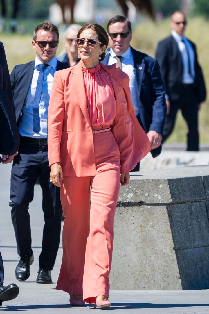 2025年7月にエーレスンド橋の25周年記念式典に出席したメアリー王妃は、初夏に映えるコーラルピンクのパンツスーツを披露しました。王妃の故郷オーストラリアのブランド、スキャンラン・セオドアによるこのセットアップは、大きな襟のジャケットとセンタープリーツのパンツによる端正なシルエットが魅力です。インナーのブラウスからパンプスまで全て同系色でまとめつつ、トーンをわずかに変えることで全身に自然な立体感を演出。甘い印象のピンクをマニッシュなフォルムで取り入れた、大人の女性にふさわしいスマートなスタイルです。大切なプレゼンや会食といったビジネスシーン、ホテルのレストランでのランチや記念日の集まりなど、凛とした美しさを印象づけたい場面にぴったりです。