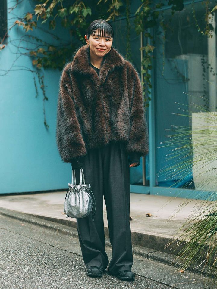 シルバーの巾着バッグで、暗くなりがちな冬コーデに華やかさをプラス。小物使いで完成度をぐっと引き上げるテクニックはお見事!